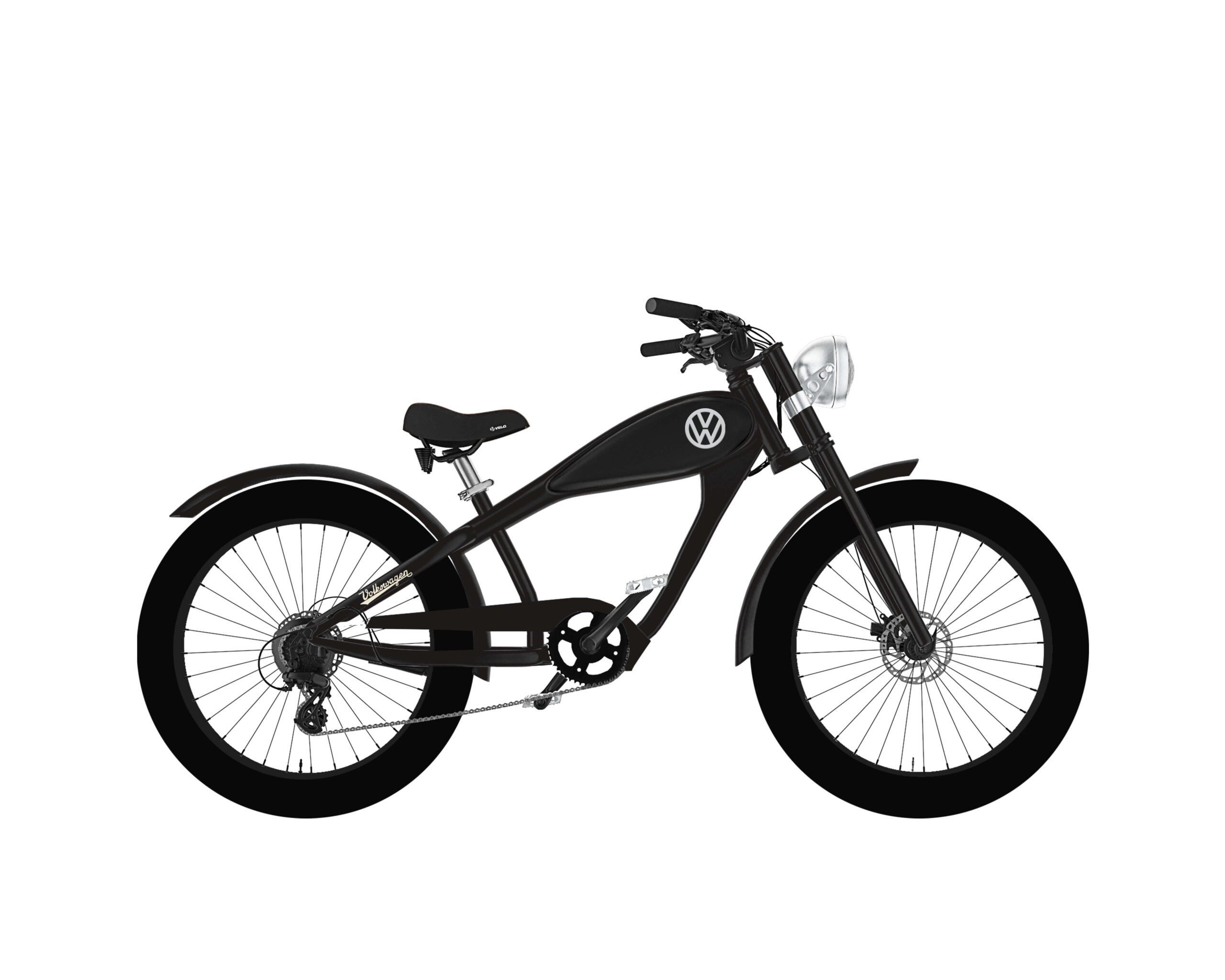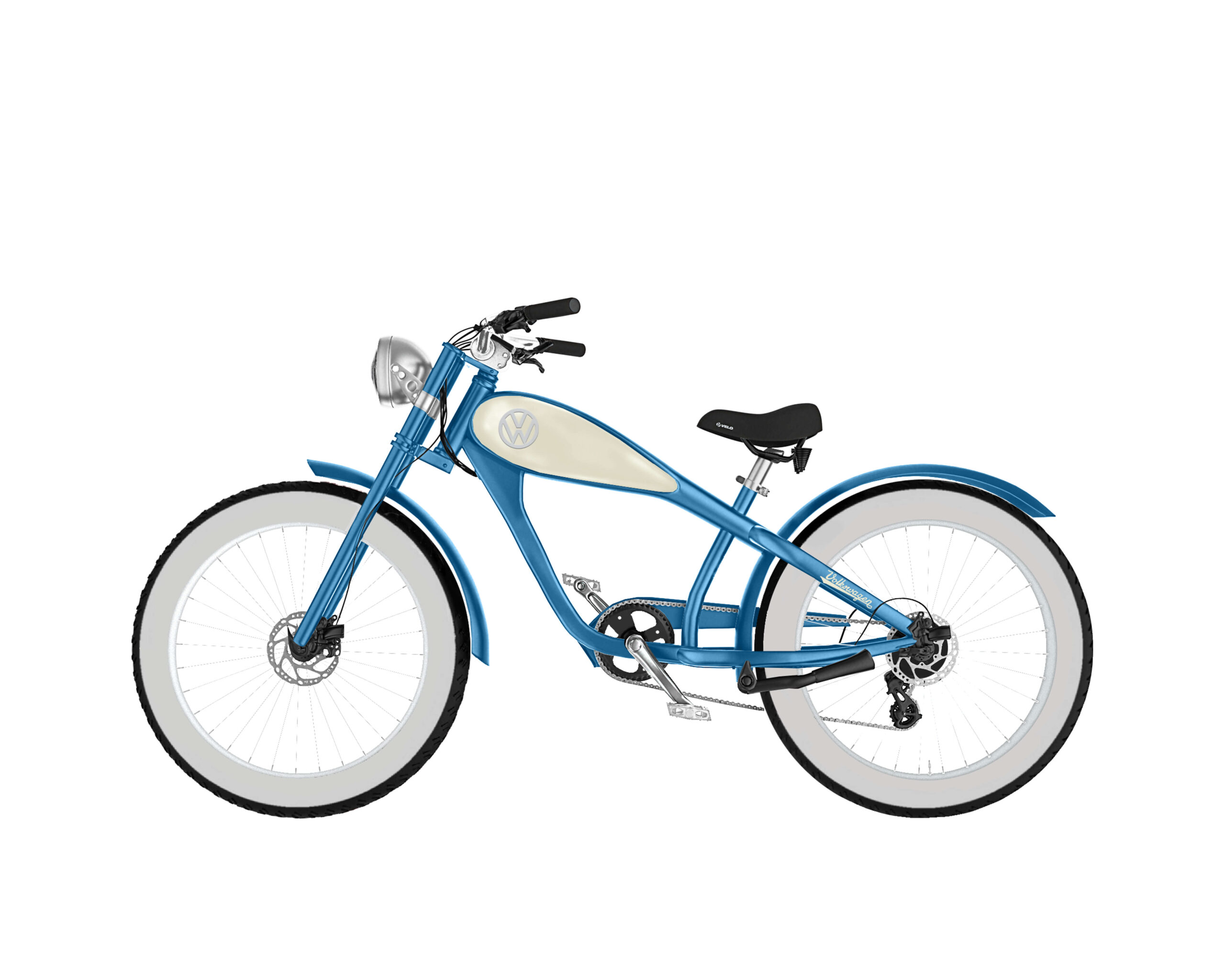 Auf dem Tank des E-Bikes befindet sich das historische Volkswagen Logo. Mehr als nur ein Markenzeichen, steht dieses Logo für eine Ära, in der der VW Bulli die Straßen eroberte. Der Tank hat gleichzeitig auch einen funktionalen Zweck. Denn hinter der Tankschale in original Bullifarbe verbirgt sich der Akku des E-Bikes. Dieser Lithium-Ionen-Akku von Samsung besitzt eine Kapazität von 21 Ah / 756 Wh und eine Reichweite von 80 km.